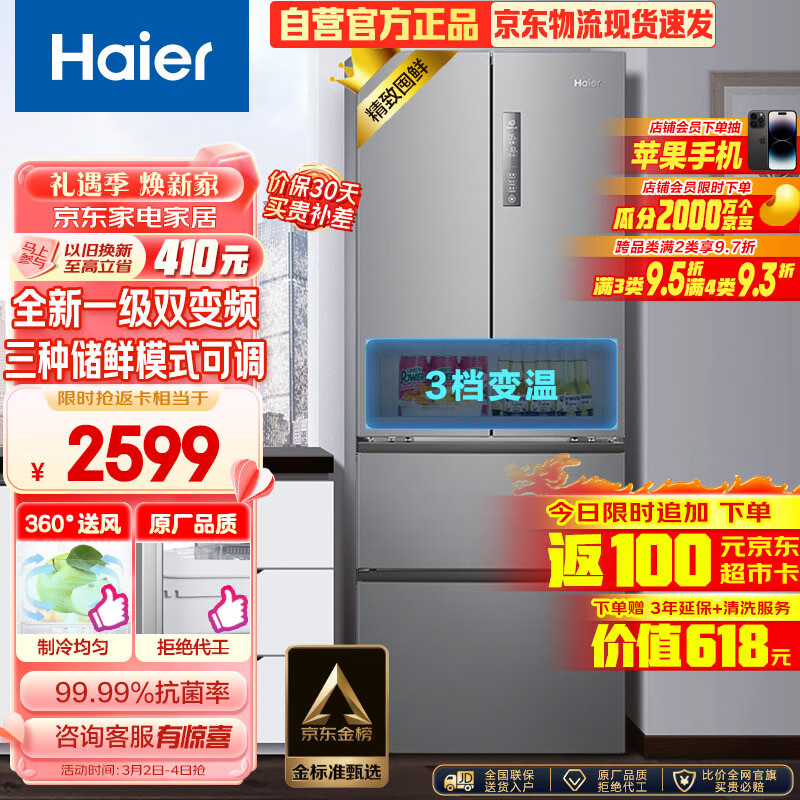 海尔(Haier)335升星辉法式多门四开门电冰箱小户型家用一级能效变频节能风冷无霜租房BCD-335WLHFD9DS9价格:2699.00元!