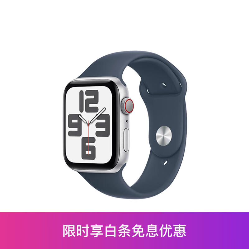 Apple/苹果 Watch SE 2023款智能手表 蜂窝款44毫米银色铝金属表壳风暴蓝色运动型表带M/L MRHK3CH/A【免息版】价格:2599.00元!
