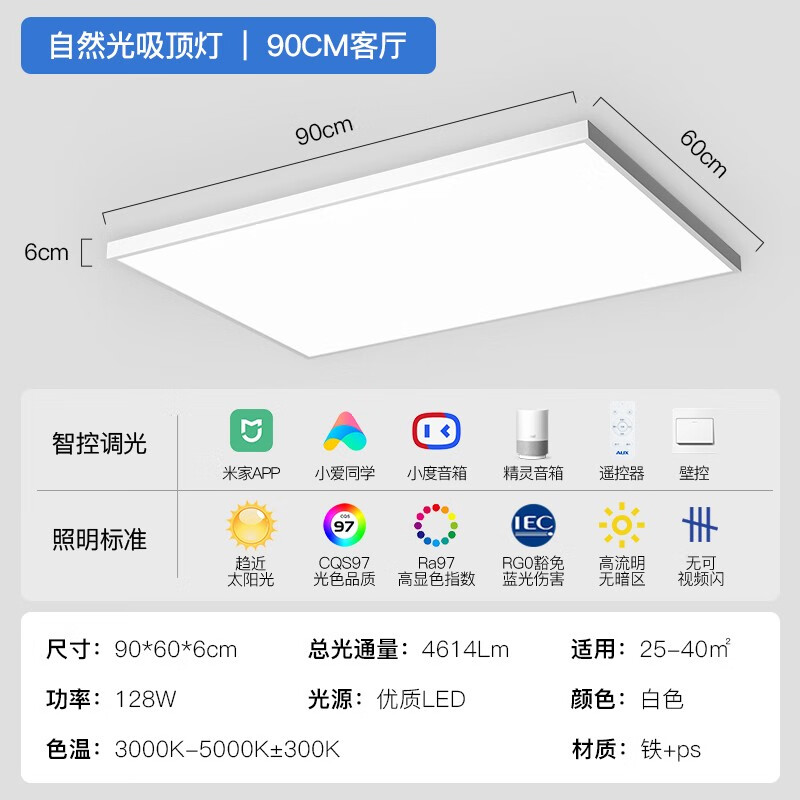 奥克斯(AUX) 客厅灯卧室书房全光谱健康照明吸顶灯全屋智能儿童房模拟自然光 (多网智控/97高显)128瓦/25-40㎡价格:410.00元!