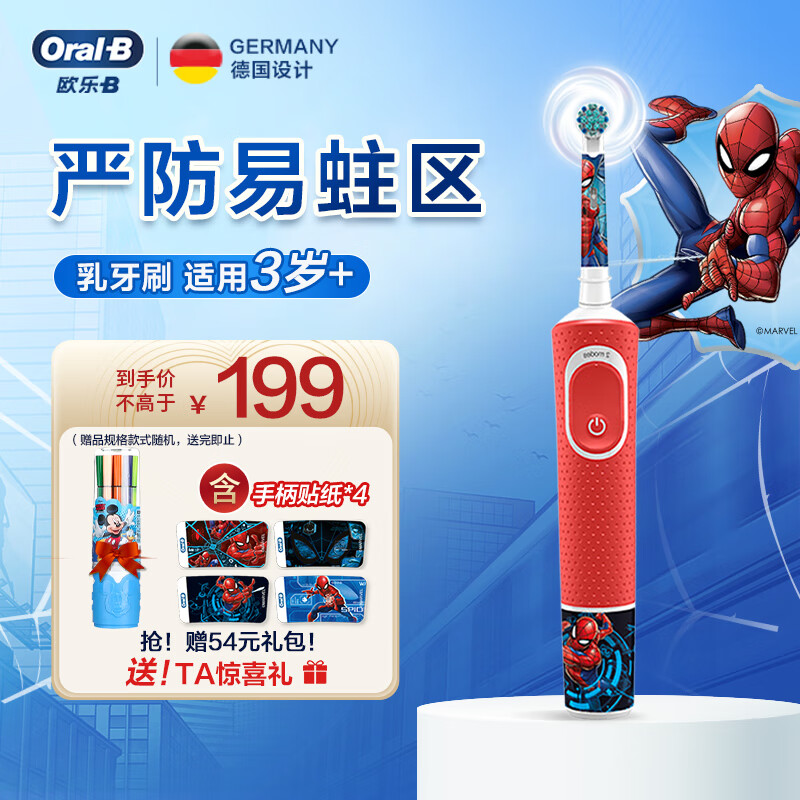 欧乐B儿童电动牙刷 3-7岁乳牙期专用 护齿 乳牙刷 蜘蛛侠款 圆头牙刷(图案随机) D100K kids 日常清洁价格:199.00元!