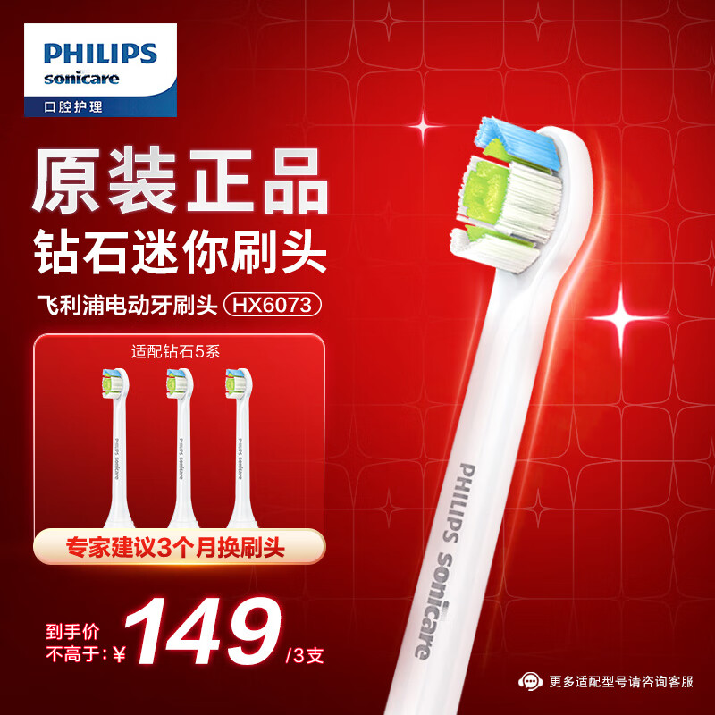 飞利浦电动牙刷刷头 钻石亮白型刷头W2 HX6073/67 3支装迷你型 白色 适配钻石5系价格:149.00元!