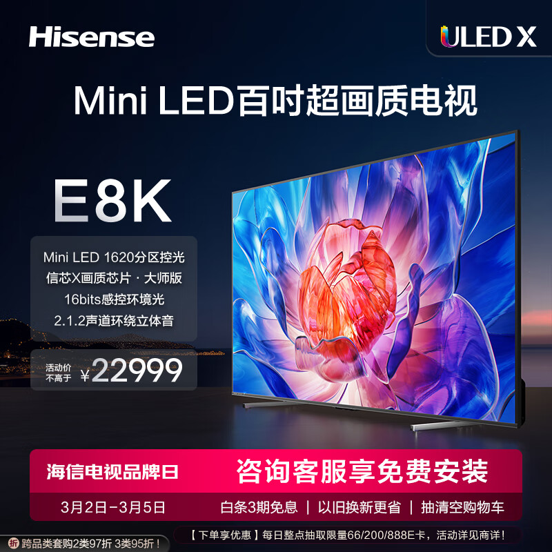 海信电视100E8K 100英寸 ULED X 百吋超画质MiniLED 1620分区 液晶智能平板电视机 以旧换新 98英寸+价格:22999.00元!
