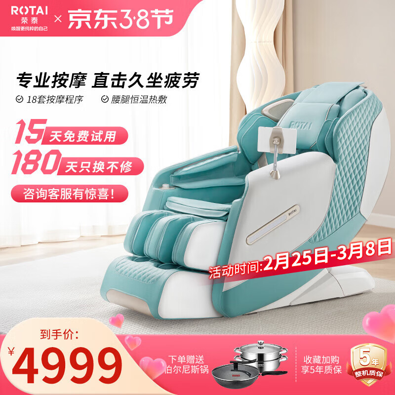 荣泰(RONGTAI) 按摩椅家用全身太空舱零重力多功能智能电动按摩沙发椅子生日礼物 A50 苹果绿价格:10999.00元!