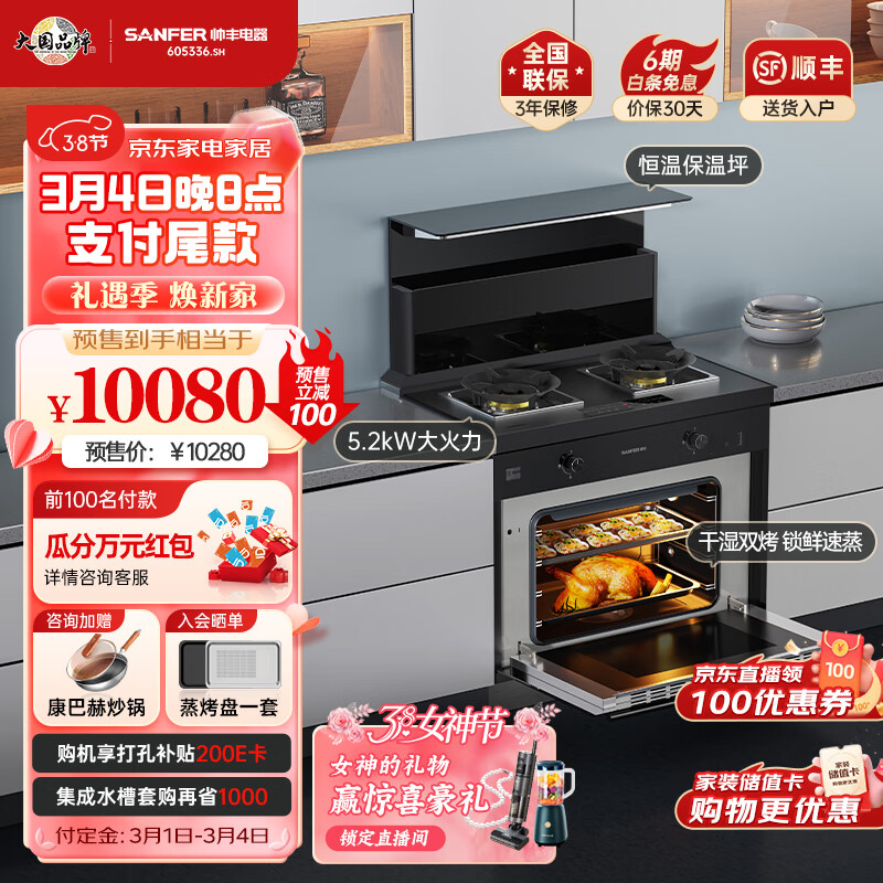 帅丰(SANFER)J2-7B-90S 集成灶蒸烤一体集成灶 蒸箱 烤箱 蒸烤箱 集成一体燃气灶 操作记忆功能 天然气价格:10280.00元!