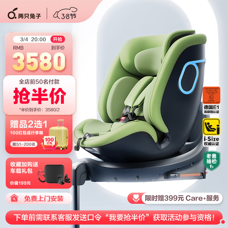 两只兔子求知2pro智能通风车载婴儿童座椅0-4-12岁宝宝汽车用 极光绿价格:4880.00元!