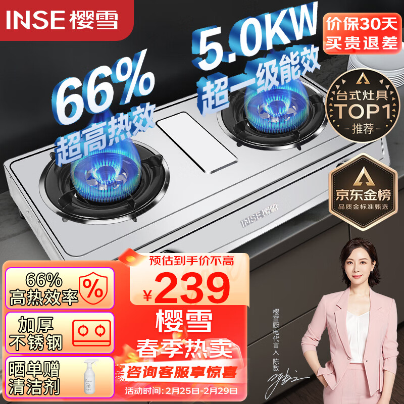 樱雪(INSE)燃气灶双灶 煤气灶 不锈钢5.0KW猛火台式双灶 66%热效率 熄火保护T2332液化气价格:239.00元!