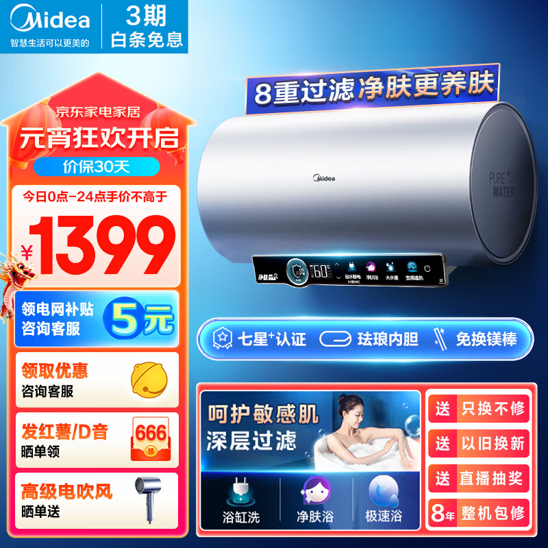 美的(Midea)净肤洗电热水器60升家用 3300W变频 出水断电 镁棒免更换 一级能效京东小家智能生态F6032-JA7(HE)价格:1499.00元!