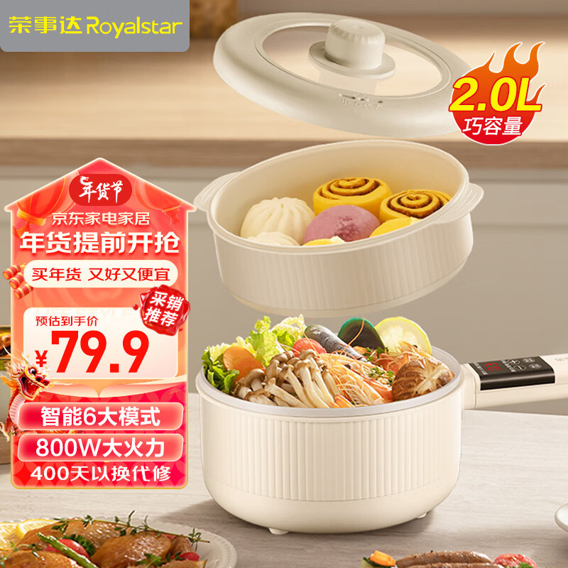 荣事达(Royalstar)电煮锅 家用多功能学生宿舍泡面电火锅蒸煮煎炒锅电热锅小电锅电炒锅 智能+蒸笼 DZG20K6价格:79.90元!