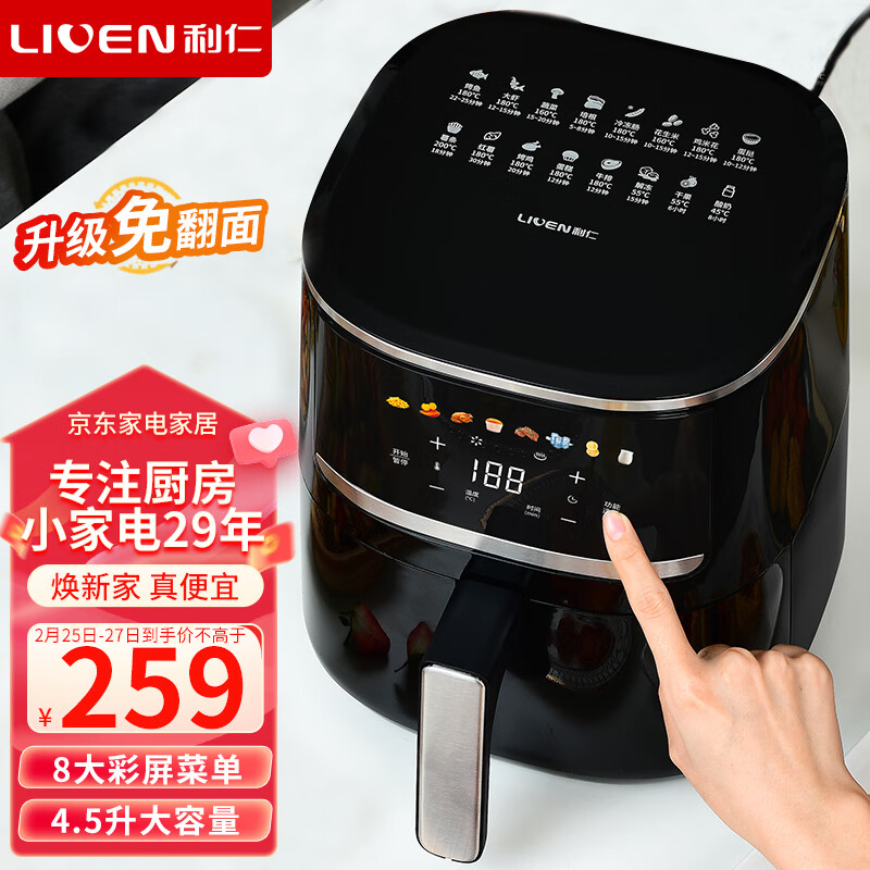利仁(Liven)空气炸锅家用4.5升大容量智能无油电炸锅蒸汽炸锅 多功能空气炸锅烤箱全自动薯条机KZ-D4516价格:259.00元!