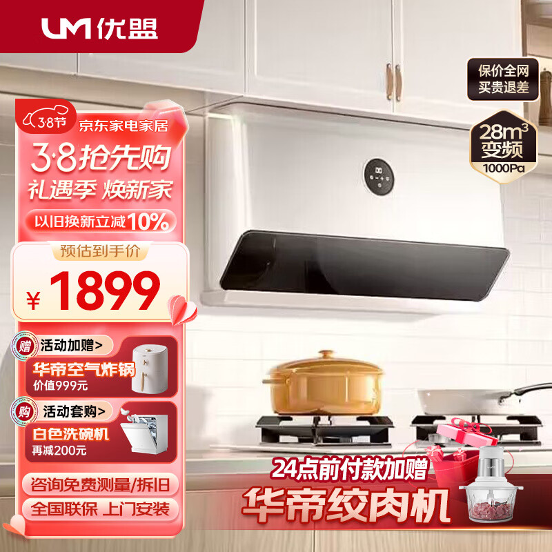 优盟(UM)超薄近吸油烟机 白色 变频家用大吸力抽油烟机自动清洗 28立方厨房脱排免拆洗CR01价格:1899.00元!