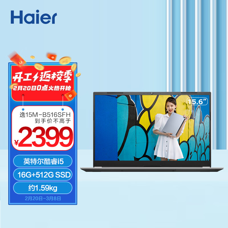 海尔(Haier)15.6英寸金属笔记本电脑 商务办公学生影音娱乐轻薄本 逸15M 11代i5 (16G 512G SSD Win11)价格:2399.00元!