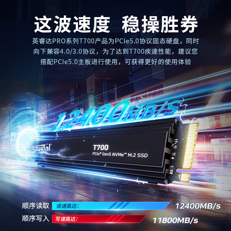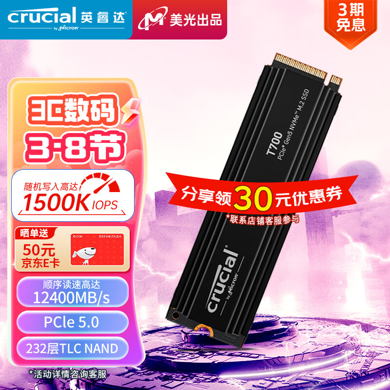Crucial英睿达 美光 2TB SSD固态硬盘 M.2接口(NVMe协议) PCIe5.0读速12400MB/s Pro系列 T700马甲散热价格:2799.00元!