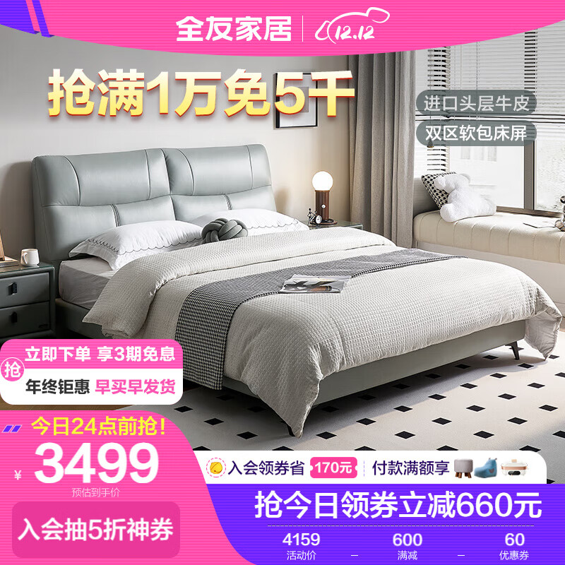 全友家居 意式轻奢皮床卧室头层牛皮床屏双人床(2-2)皮床105201价格:4159.00元!