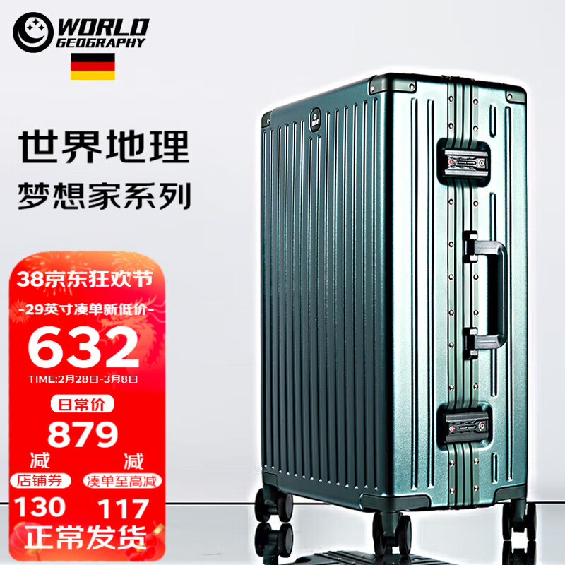 地理德国行李箱男女29英寸铝框旅行箱杯架拉杆箱万向轮密码箱 英伦绿价格:879.00元!