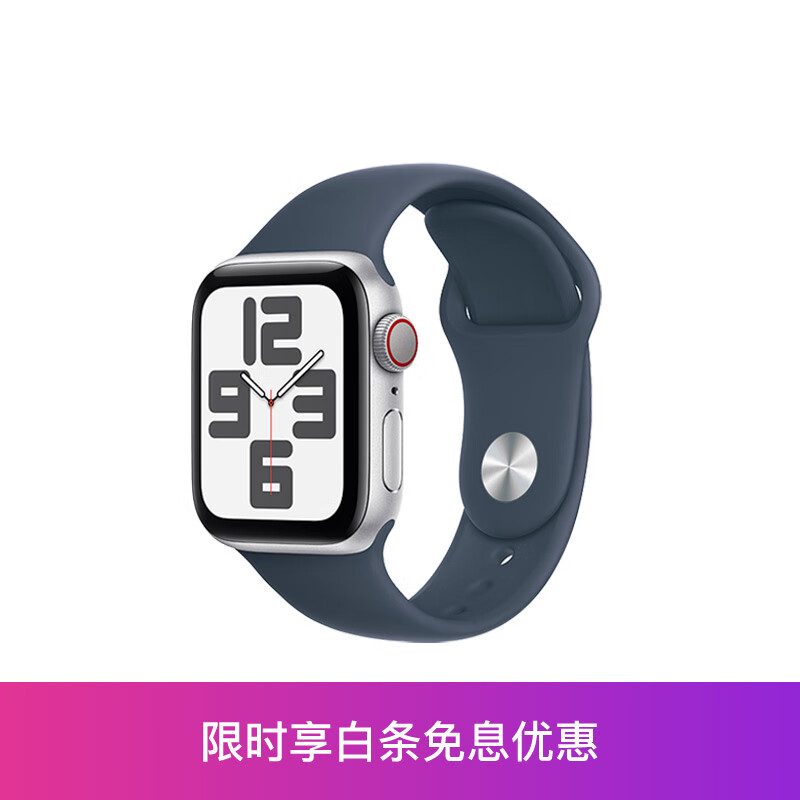 Apple/苹果 Watch SE 2023款智能手表 蜂窝款40毫米银色铝金属表壳风暴蓝色运动型表带S/M MRGK3CH/A【免息版】价格:2399.00元!