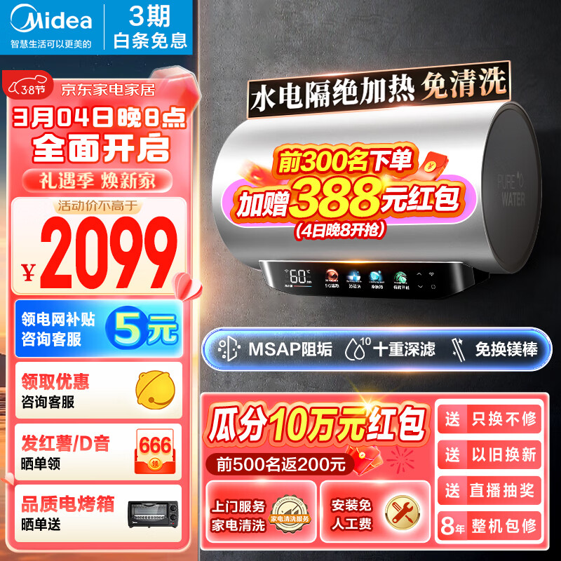 美的(Midea)水电分离60升电热水器家用 3300W变频 10重过滤净肤 瓷净舱除余氯 内胆免清洗F6033-PE9(HE)价格:2299.00元!