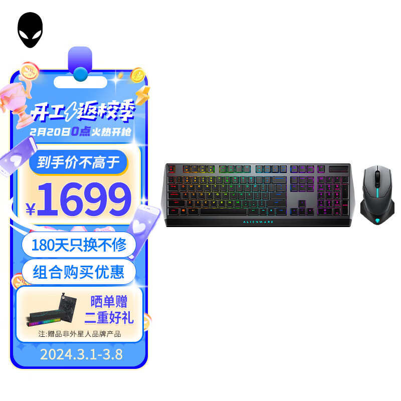 外星人(Alienware)610M+510K 键鼠套装(无线游戏鼠标 有线机械键盘 )RGB高端电竞外设 送男友 送女友 黑色价格:1699.00元!