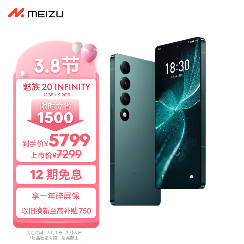 魅族(MEIZU)20 INFINITY无界版 骁龙8Gen2 Flyme系统 2K+臻彩屏 5G游戏学生拍照 领克手机域 星云绿 12+512GB价格:5799.00元!