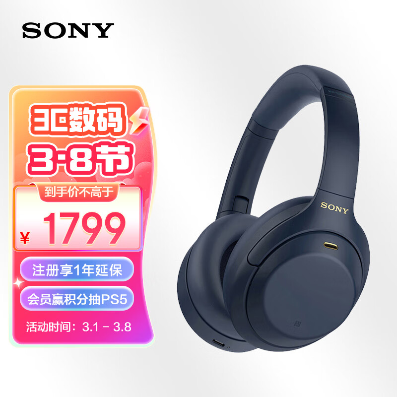 索尼(SONY)WH-1000XM4 高解析度无线蓝牙 智能降噪 头戴式 深夜蓝价格:1799.00元!