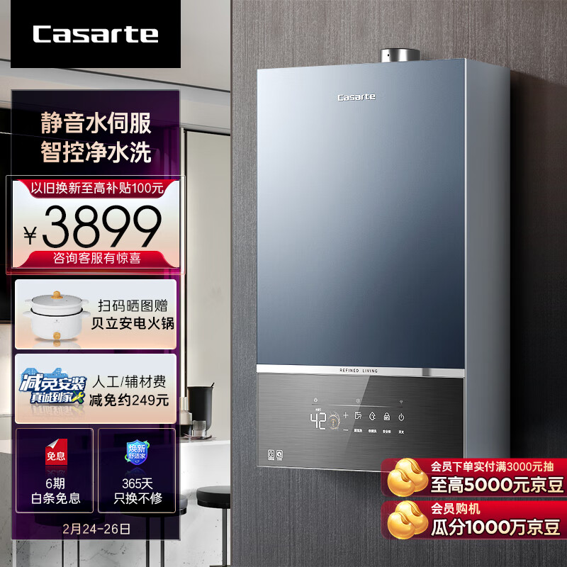 卡萨帝(Casarte)16升家用燃气热水器天然气母婴级恒温水伺服静音强排式下置风机多重净化JSQ31-16CWP3FPXCU1价格:3899.00元!