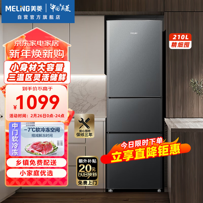 美菱(MELING)210升三门小冰箱三温区中门软冷冻家用宿舍租房实用小巧不占地节能低音BCD-210L3CD典雅灰价格:1099.00元!