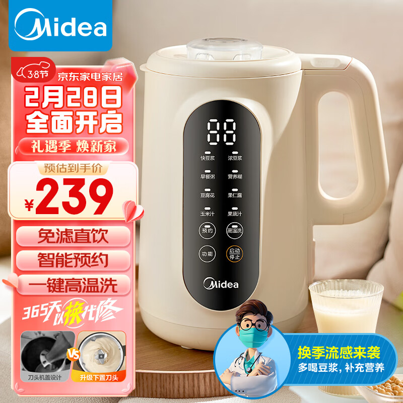 美的(Midea)豆浆机1L小型全自动清洗免煮免过滤破壁料理机双层防烫可做豆花智能预约DJ10W2-006S价格:239.00元!
