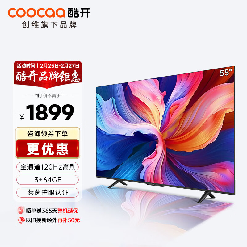 酷开创维K3 Pro 55英寸电视 120Hz高刷 3+64G 4K护眼 声控投屏液晶平板游戏电视机以旧换新55P3D Max价格:2299.00元!