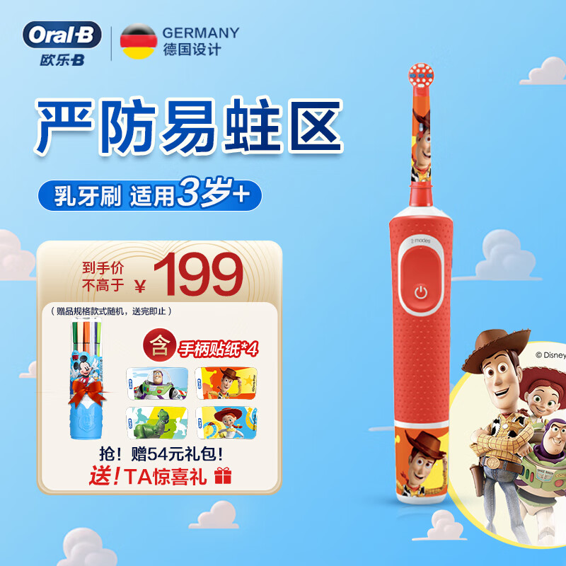 欧乐B儿童电动牙刷 3-7岁乳牙期专用护齿乳牙刷 玩具总动员/皮克斯(图案随机)D100K kids 日常清洁价格:199.00元!