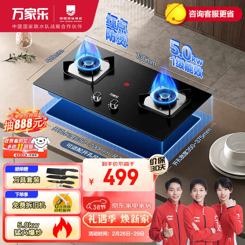 万家乐燃气灶 5.0kW大火力 台式嵌入式两用燃气灶 家用双灶高温防烫提醒 钢化玻璃全进风JZT-AY4天然气价格:599.00元!
