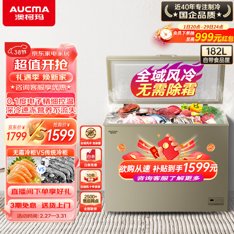 澳柯玛(AUCMA)182升风冷无霜冰柜家用商用单温冷藏柜冷冻柜母乳小冰柜商用小型冷柜冰箱BC/BD-182WD以旧换新价格:1599.00元!