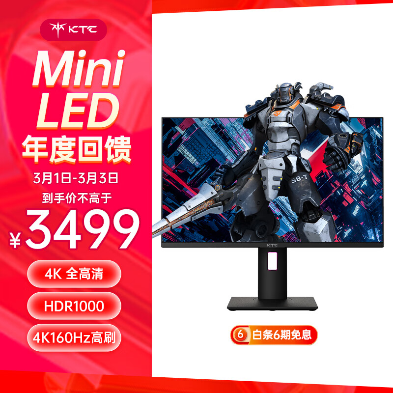 KTC 27英寸 4K160Hz MiniLED 广色域1msIPS低蓝光Type-C90W 旋转升降HDR1000电脑显示器 M27P20 Pro价格:3699.00元!