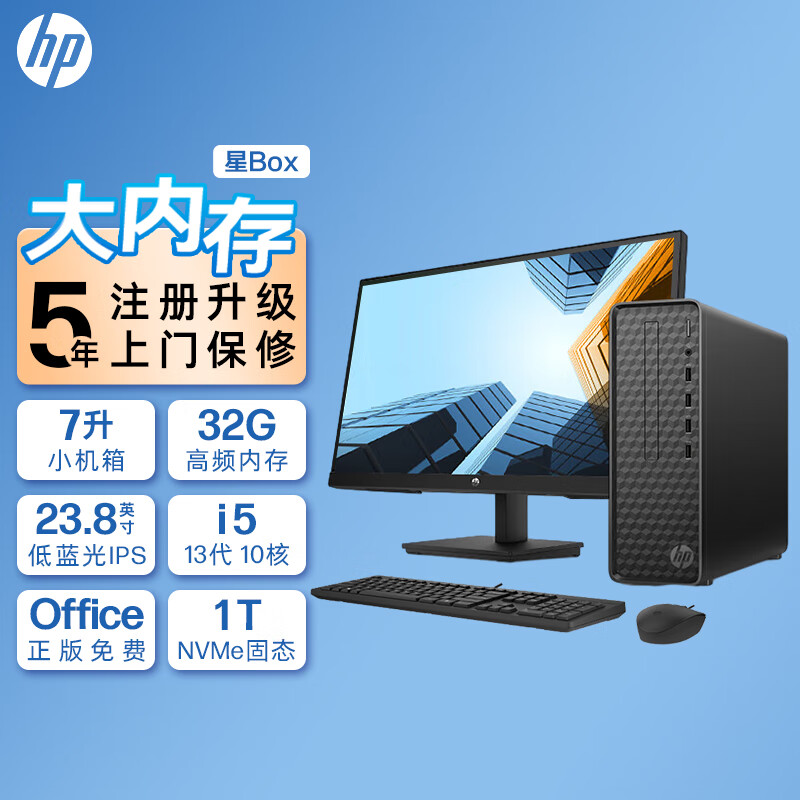 惠普HP 星Box商务办公台式电脑主机(13代酷睿i5-13400 32G 1TB固态硬盘 WiFi 注册五年上门)+23.8英寸价格:4399.00元!