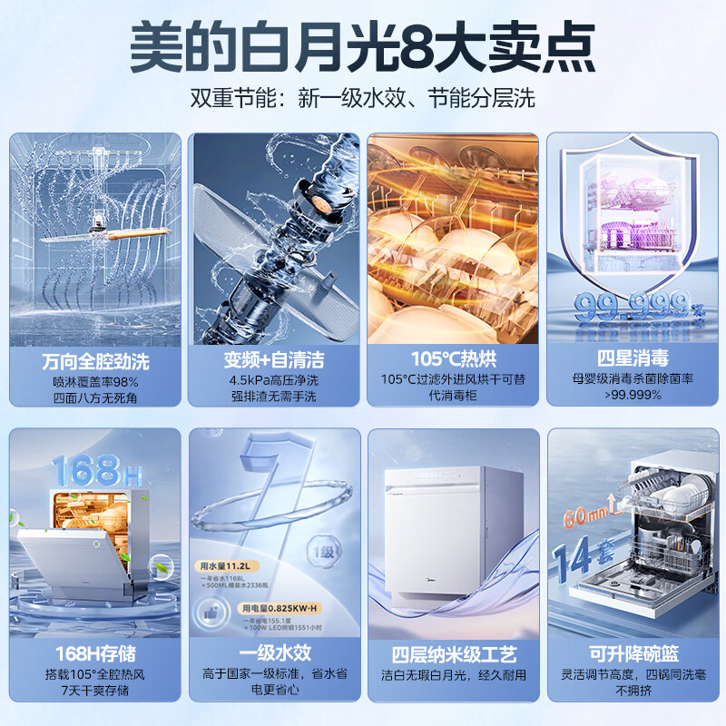 美的(Midea)白月光万向洗碗机嵌入式14套大容量105℃热风烘干四星消毒一级水效168h存储变频万向星河X6(白)价格:7599.00元!