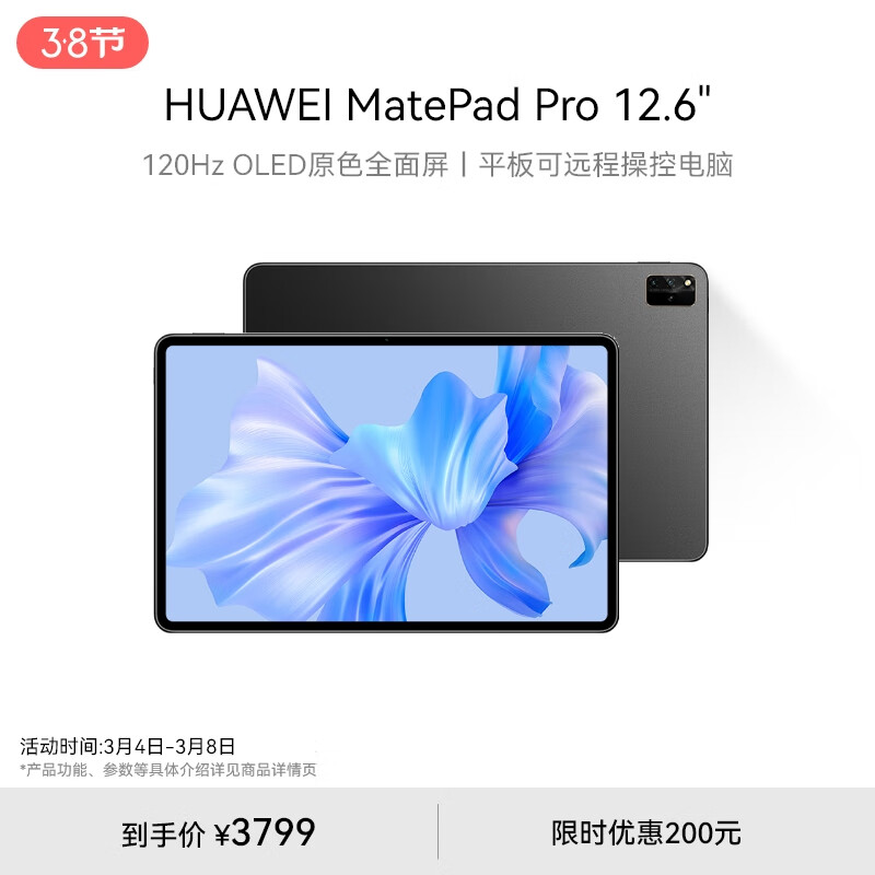 HUAWEI MatePad Pro 12.6英寸华为平板电脑HarmonyOS 2.5K高清120Hz屏办公学习 8+256GB WIFI 曜金黑价格:3999.00元!