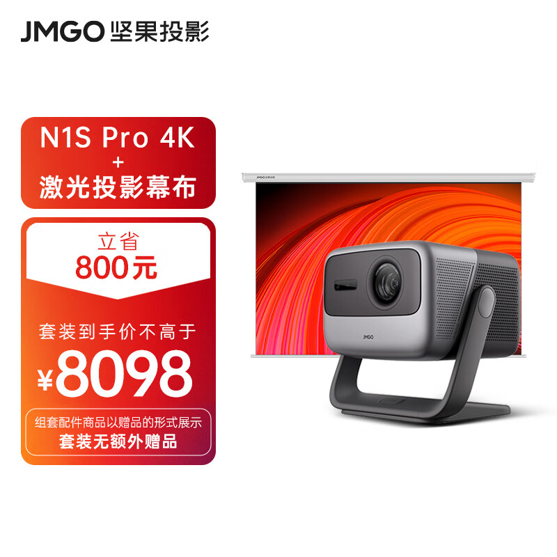 坚果投影(JMGO)N1S Pro 4K超高清三色激光 云台投影仪 2000CVIA家庭影院家用套装【主机+专用增益幕布】价格:7398.00元!