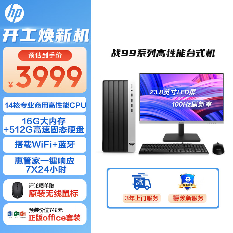 惠普(HP)战99 台式电脑主机(酷睿13代i5-13500 16G 512G)23.8英寸大屏显示器 WiFi 蓝牙 14核高性能CPU价格:3999.00元!