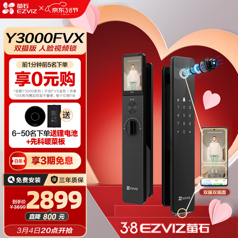 萤石Y3000FVX智能锁 静谧黑 3D人脸识别无需指纹 双摄双画面可视 家用全自动智能猫眼门铃防盗视频锁价格:2899.00元!