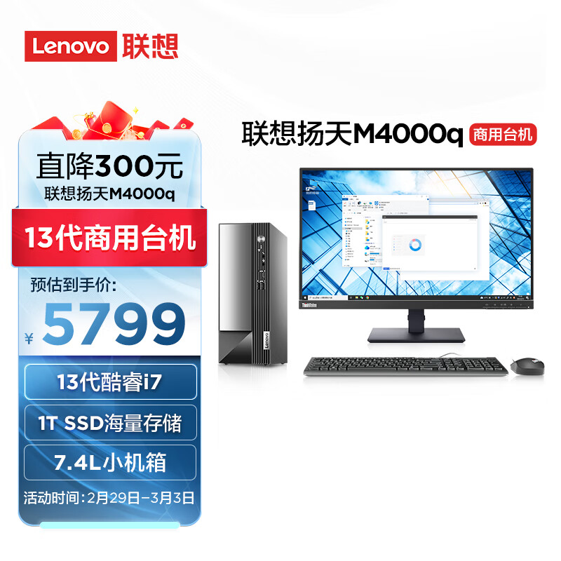 联想(Lenovo)扬天M4000q 商用办公台式电脑主机(酷睿13代i7-13700 16G 1TB SSD)23英寸价格:5799.00元!