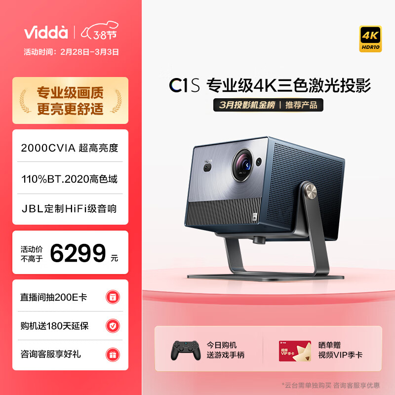 Vidda C1S 海信 4K超高清纯三色激光 投影仪家用家庭影院卧室白天投墙办公智能护眼 2000CVIA高亮价格:6298.00元!