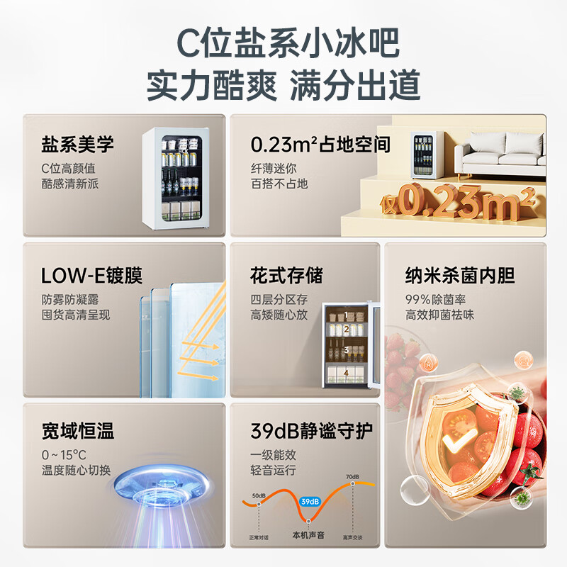 5、冰箱美观,静音,又小巧实用,主要是用于让小孩带到单位宿舍里??冷藏酸奶。这个空间容量足够了。特地选的压缩机款,这种制冷效果好。外形外观:小巧美观,不占空间制冷效果:制冷效果很好,和大冰箱制冷效果无异。容量大小:冷藏冷冻布局很合理,正是我所需要的。