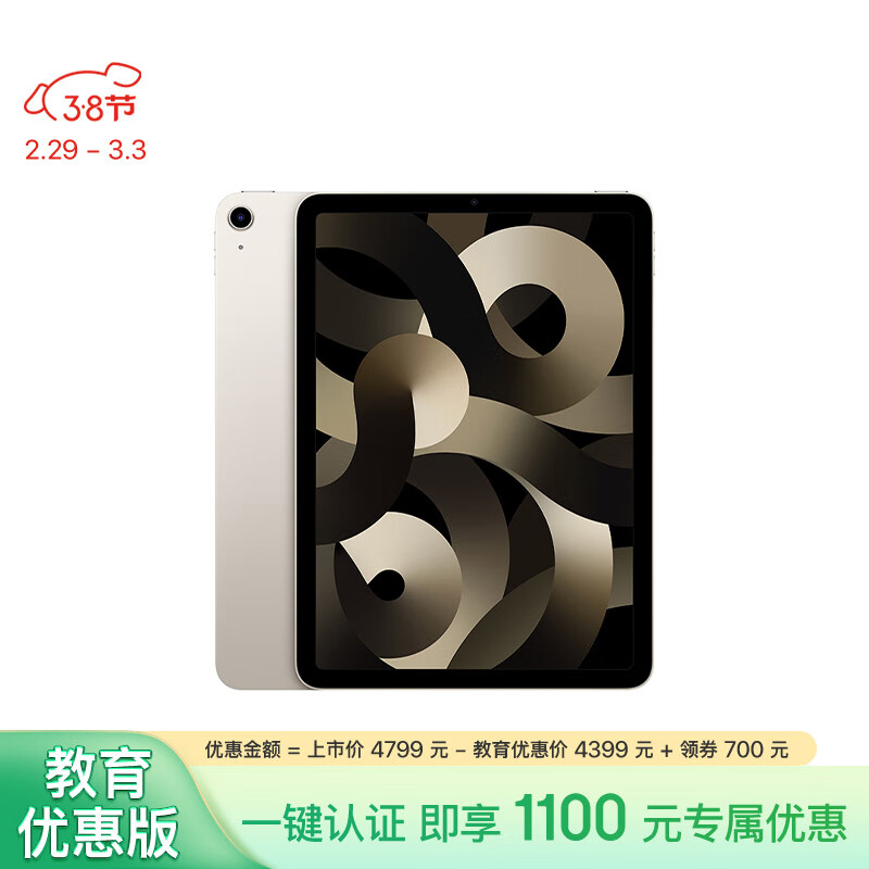 Apple/苹果【教育优惠】 iPad Air 10.9英寸平板电脑 2022款(64G WLAN版/MM9F3CH/A)星光价格:4399.00元!