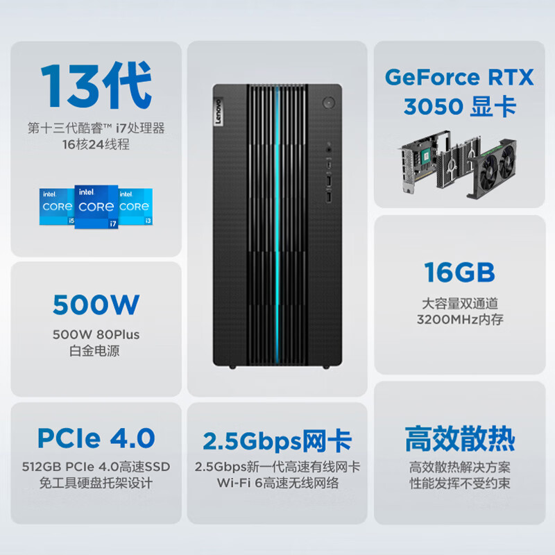 联想(Lenovo)GeekPro设计师游戏台式电脑主机(酷睿13代i7-13700F RTX3050 16G 512GB SSD )价格:6899.00元!