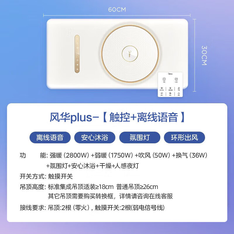 2、因为开关留在卫生间门外,买的可以离线语音的浴霸,直接语音特别方便,这款颜值特别高。注意这款浴霸没有照明功能,需要外接一个灯来照明,还是用这个开关控制