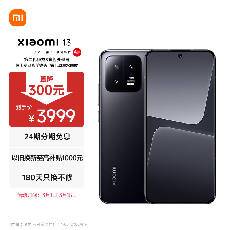 小米(MI)13 徕卡光学镜头 第二代骁龙8处理器 超窄边屏幕 120Hz高刷 67W快充 12+512GB 黑色 5G手机价格:3999.00元!