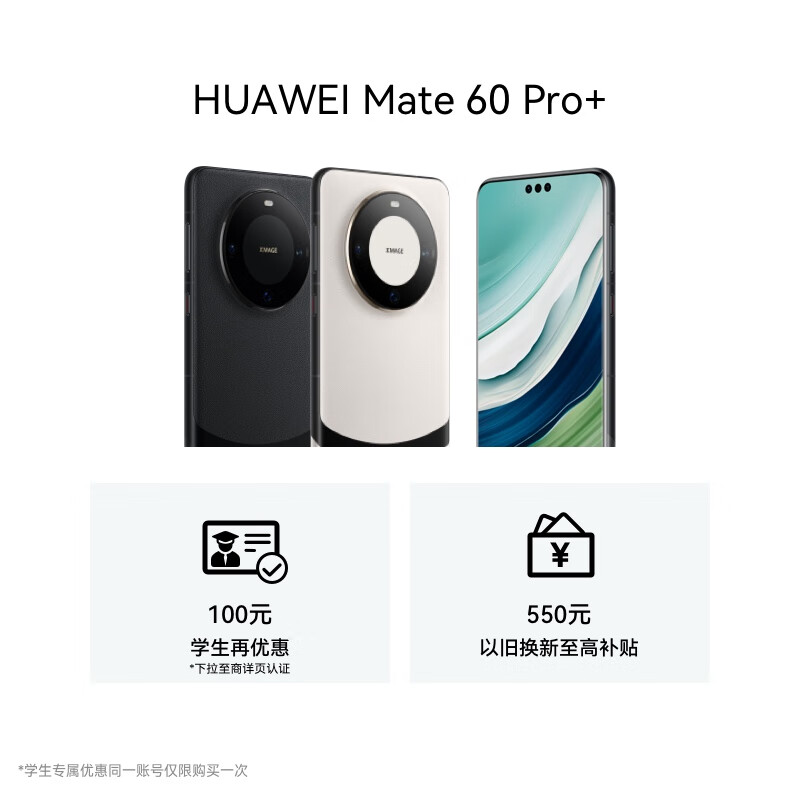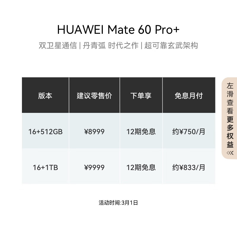 华为(HUAWEI)旗舰手机 Mate 60 Pro+ 16GB+512GB 宣白价格:8999.00元!