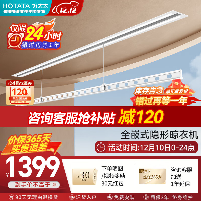 好太太(Hotata)电动智能晾衣架隐形嵌入式照明语音阳台升降晒衣服架 2米白色单杆价格:1599.00元!