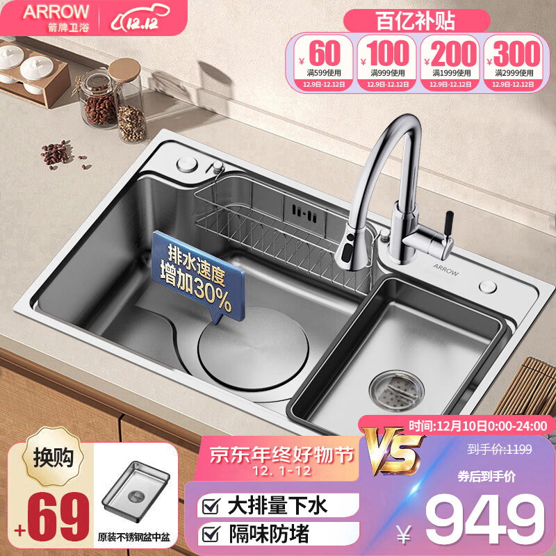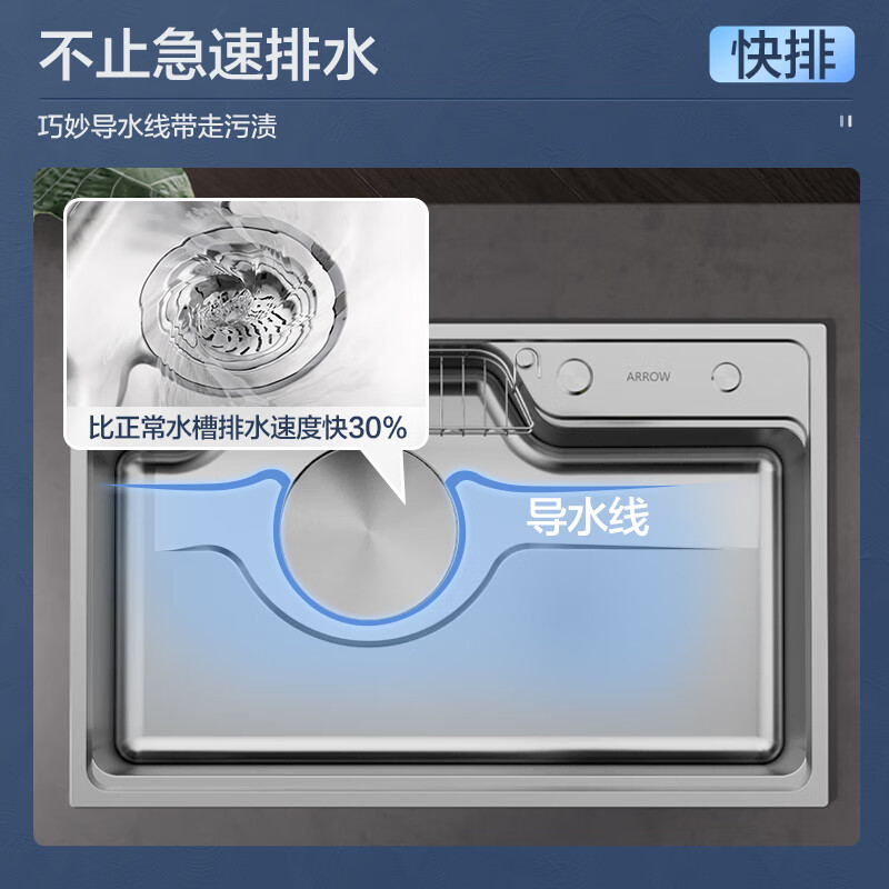 箭牌(ARROW)水槽单槽厨房洗菜盆304不锈钢家用大单槽AE5575417G21-SS+AE4585价格:1049.00元!