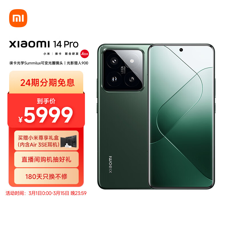 小米14Pro 徕卡可变光圈镜头 光影猎人900 小米澎湃OS 骁龙8Gen3 16+1T 岩石青 小米手机 红米手机 5G价格:5999.00元!