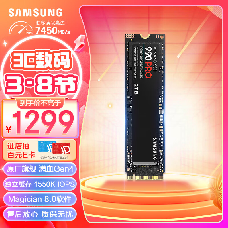 三星(SAMSUNG)2TB SSD固态硬盘 M.2接口(NVMe协议PCIe 4.0 x4) 990 PRO (MZ-V9P2T0BW)价格:1299.00元!