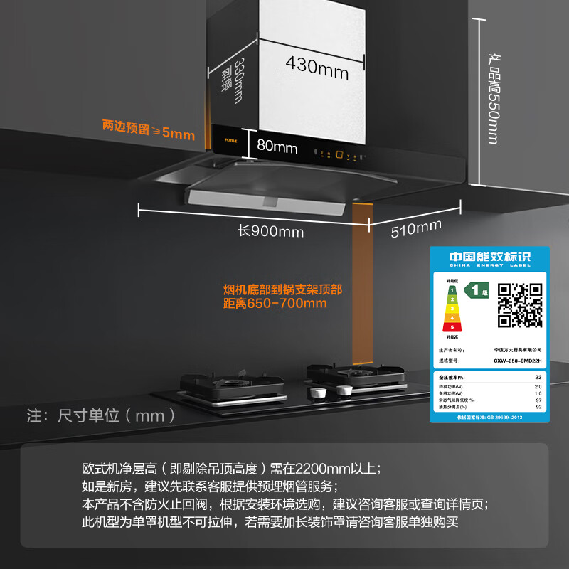 烟机安装尺寸:900±50mm